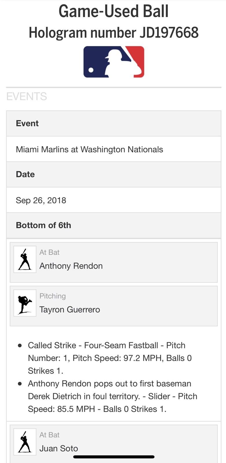 Juan Soto MLB Game Used Double Signed Baseball 9/26/18 Career Double #24 Nats