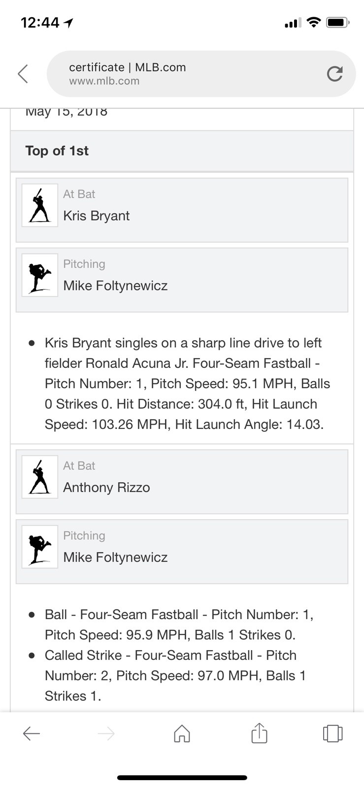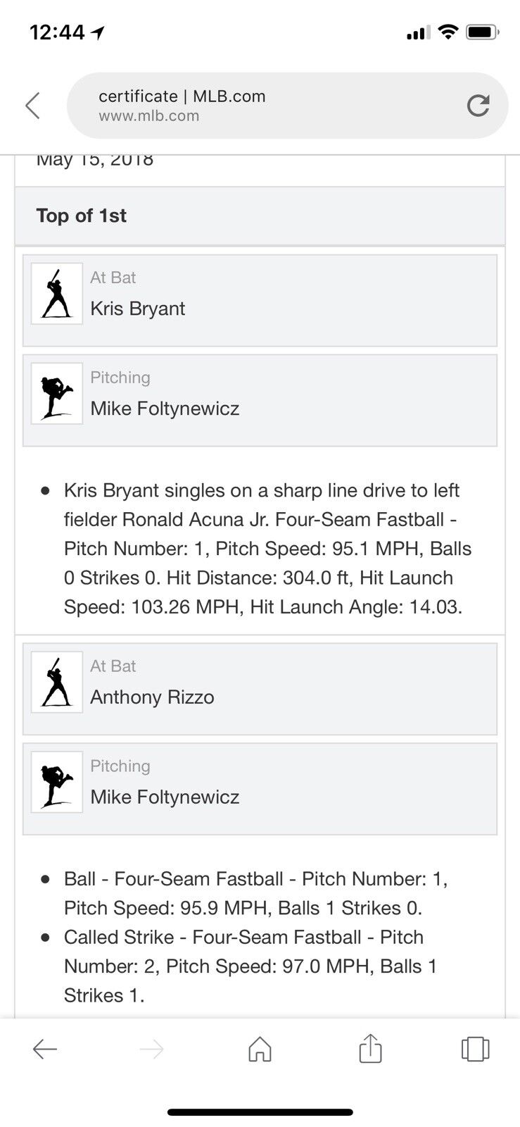 Kris Bryant MLB Game Used Single Baseball to Acuna Jr. 5/15/18 Cubs vs Braves