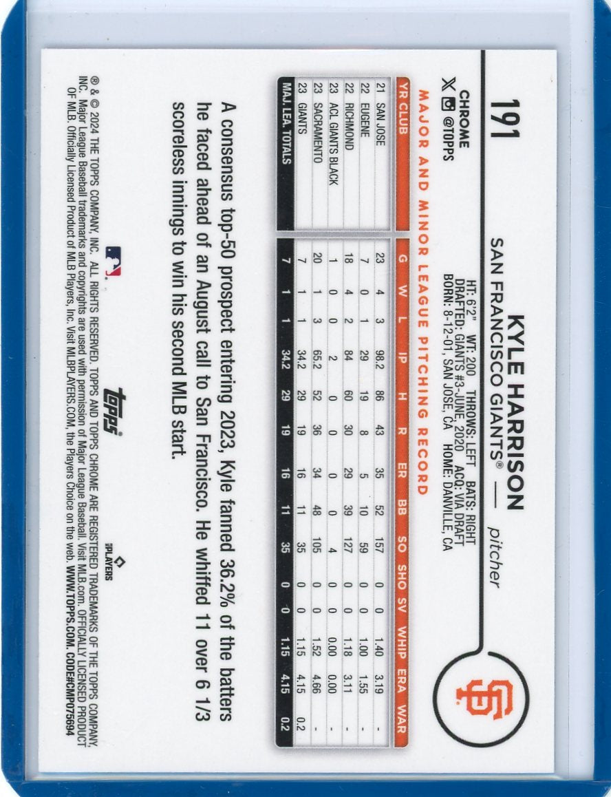 Kyle Harrison 2024 Topps Chrome blue refractor rookie card #'d 079/150
