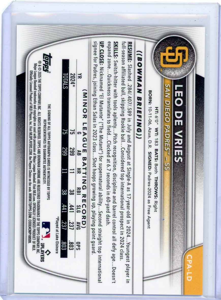 Leo De Vries 2025 Bowman Chrome autograph speckle refractor #'d 105/299