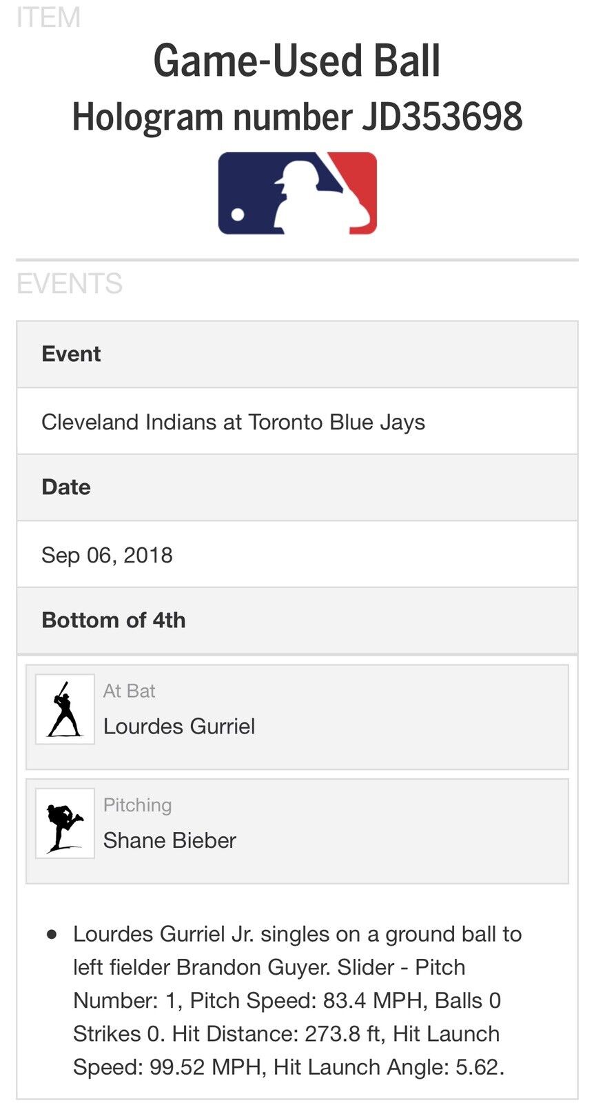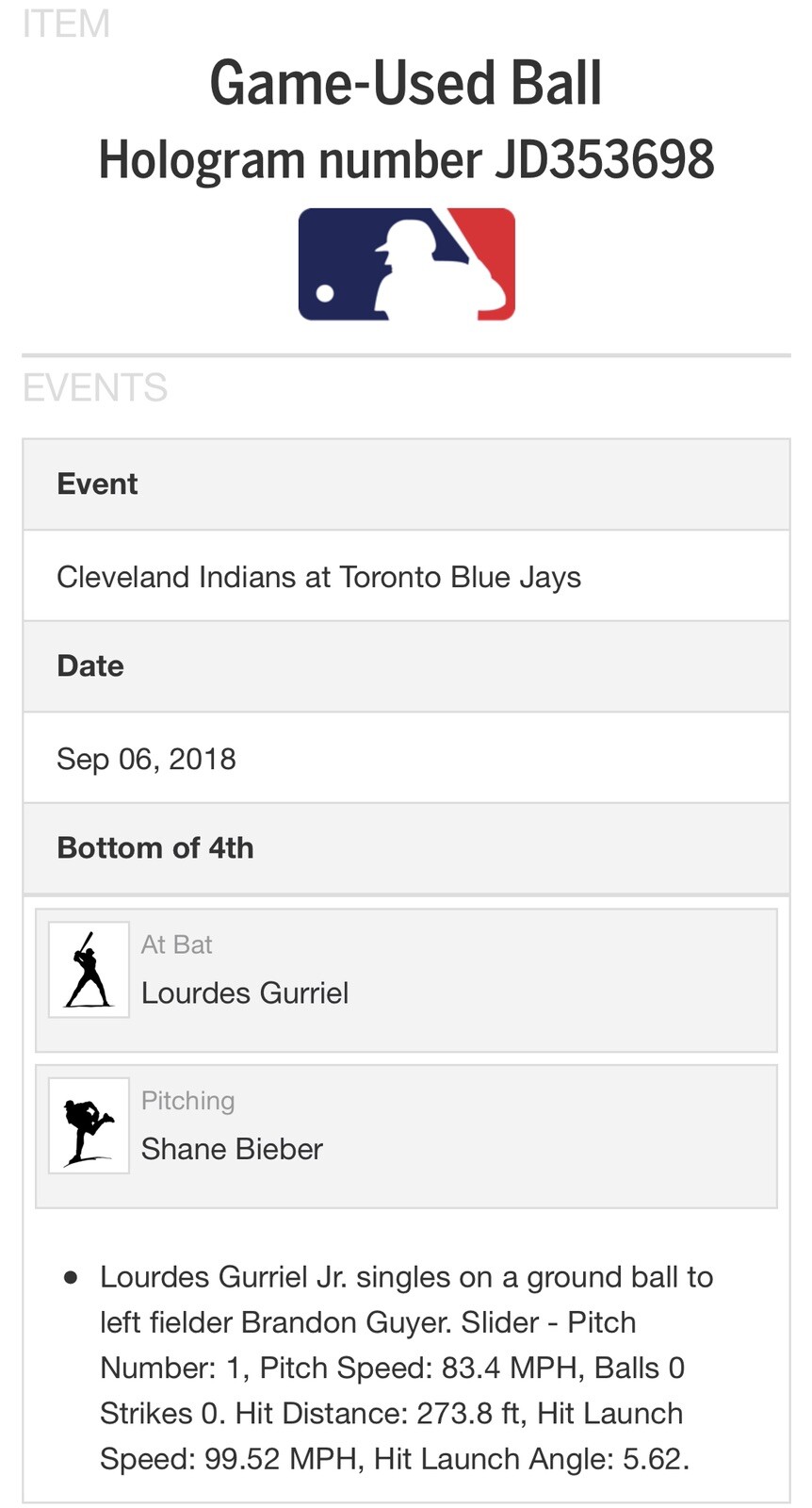 Lourdes Gurriel Jr. Game Used MLB Authenticated Single Baseball 9/6/18 Rookie