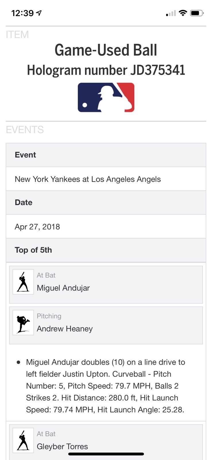 Miguel Andujar doubles (10) on a line drive to left fielder Justin Upton. Curveball - Pitch Number: 5, Pitch Speed: 79.7 MPH, Balls 2 Strikes 2. Hit Distance: 280.0 ft, Hit Launch Speed: 79.74 MPH, Hit Launch Angle: 25.28.