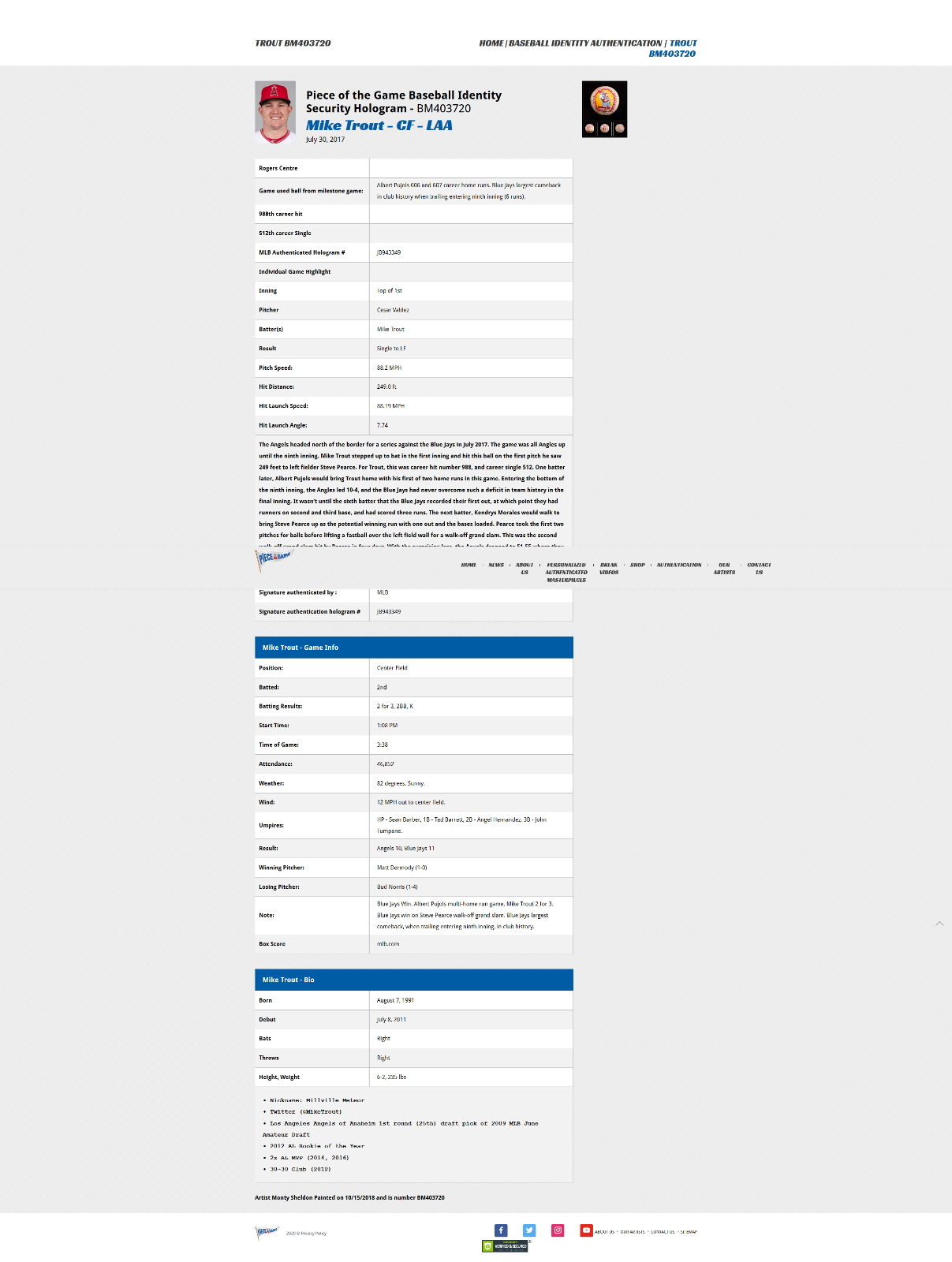 SPECIFIC PLAYER, TEAM OR VALUE. ANY GUARANTEES ARE OVER THE ENTIRE PRODUCTION RUN. BASEBALL AUTHENTICATED MASTERPIECES IS PART OF PIECE OF THE GAME, INC. AND IS NOT