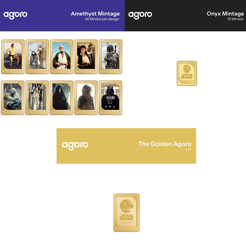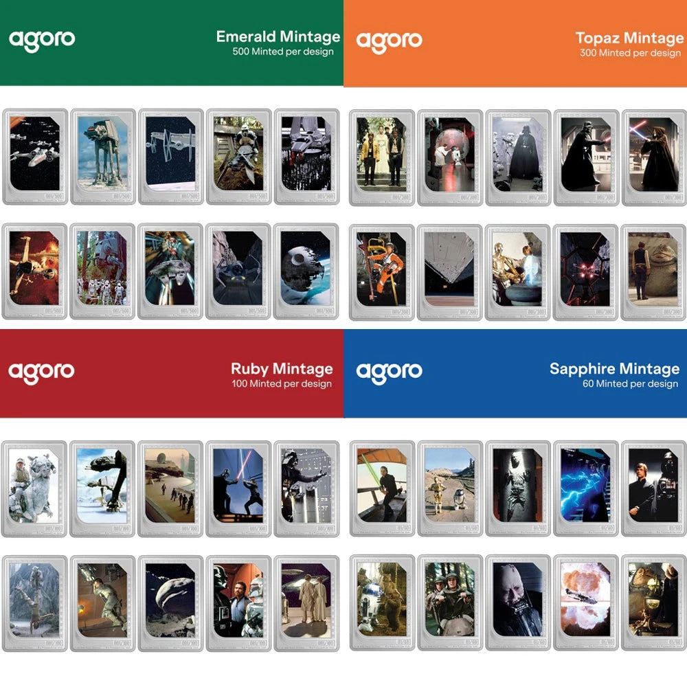 Product Features: Each sealed box contains two randomly selected coins, with designs struck in 1-oz of .999 fine silver or ultra-rare 1/4-oz fine gold. Coins are categorized by gemstone-themed mintages: Emerald (500), Topaz (300), Ruby (100), Sapphire (60), Amethyst (40, gilded), Onyx (20, gold), and a single 1-oz gold coin known as the Golden Agoro, featuring the Death Star II – the only one of its kind in the galaxy. Coins display official Star Wars imagery and are backed by the Public Seal of Niue as legal tender.