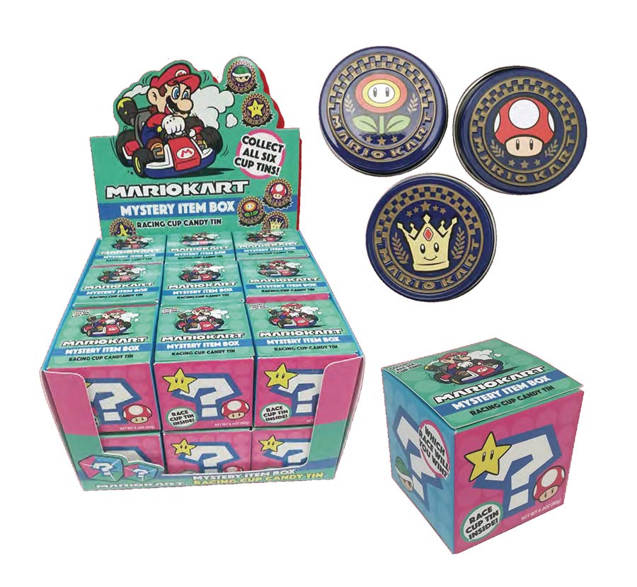Six possible race cup tins can be found. Each collectible tin holds 0.7 ounces of fruit flavored candy.
