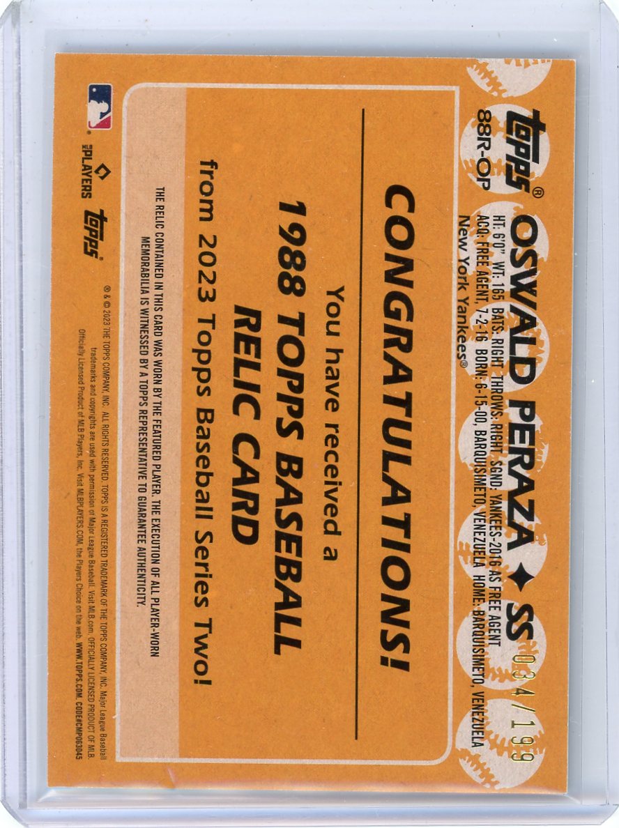 Oswald Peraza 2023 Topps Series 2 35th Anniversary jersey relic rookie card #'d 034/199