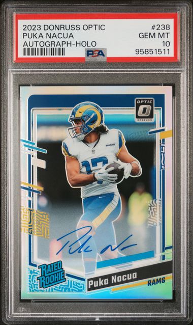 Puka Nacua 2023 Panini Donruss Optic autograph holo prizm rc #'d 082/150 PSA 10