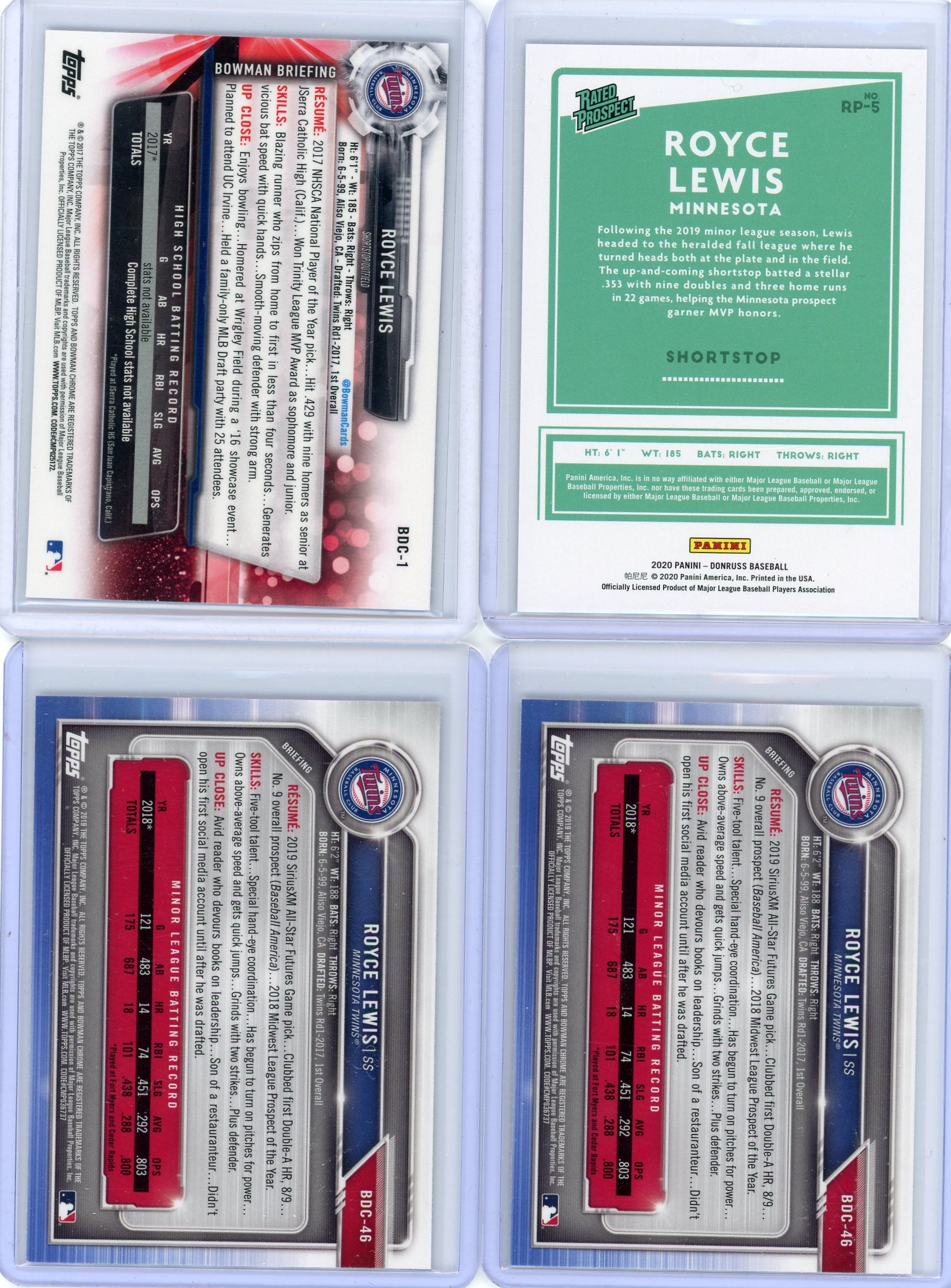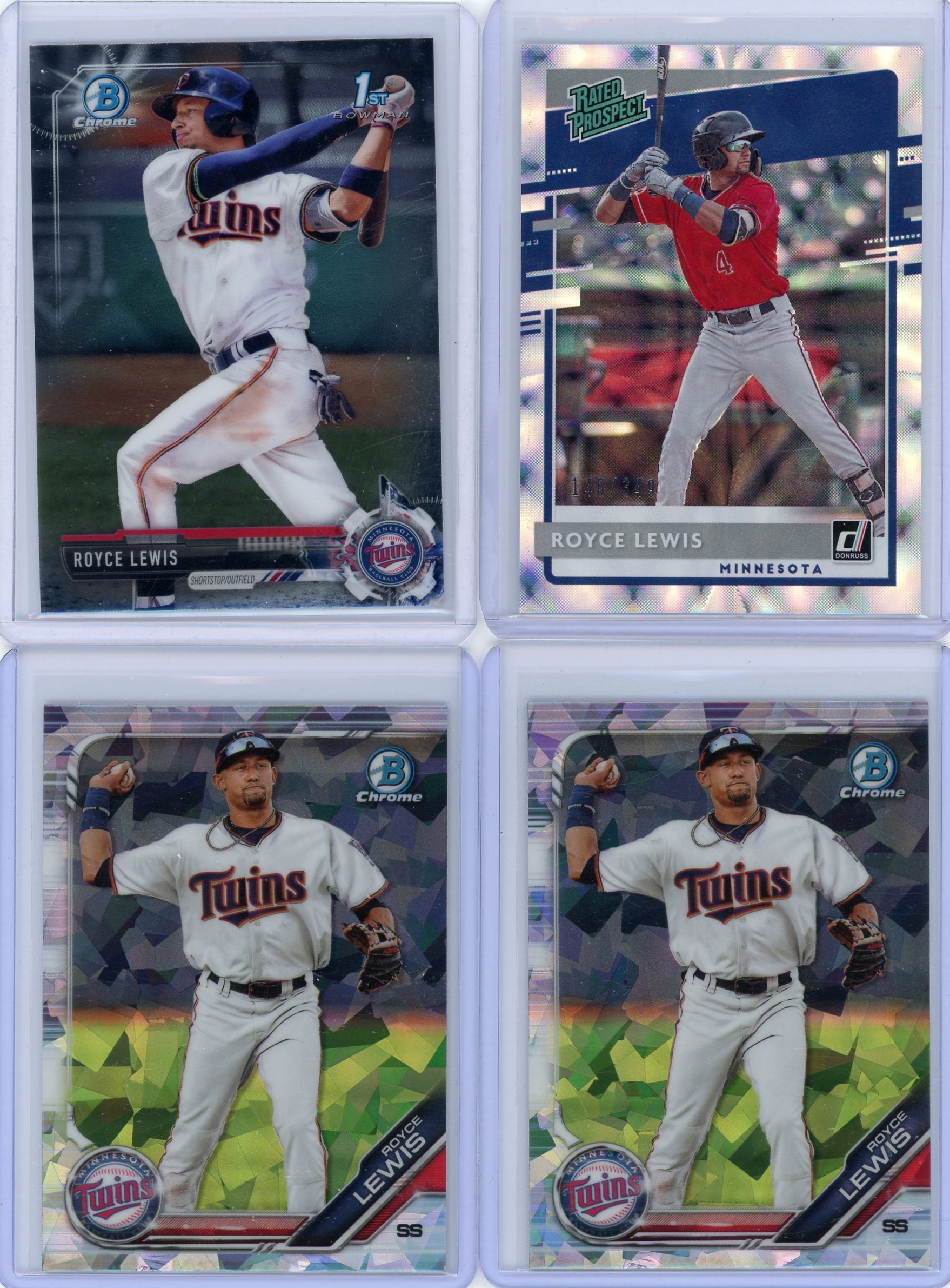 Royce Lewis 4-card lot (1st Bowman, 2x Sapphire, Donruss /349)