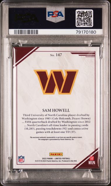 Sam Howell 2022 Panini Limited Rookie Patch Auto Jumbo Silver #'d 60/75 PSA 9
