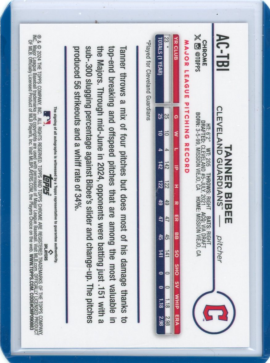 Tanner Bibee 2024 Topps Chrome Update blue raywave autograph #'d 079/150