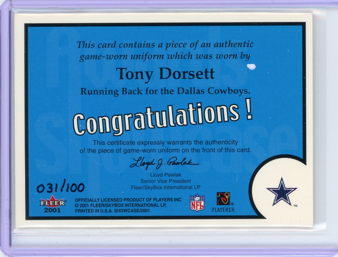Tony Dorsett 2001 Fleer Showcase Awards Showcase '77 ROTY auth. game-used jersey relic #'d 031/100