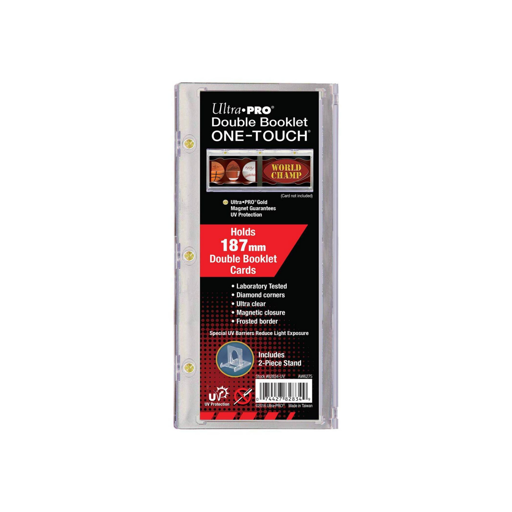 Ultra PRO's ONE-TOUCH holders are premium trading card storage cases Designed as the final destination for your booklet cards, our two-piece ONE-TOUCH holders are uniquely designed with slide-in hinge and triple-tight magnetic closure. The holder provides UV-resistant, no-PVC and acid free protection to ensure your valuable hit retains its condition while under display. Our ONE-TOUCH booklet holder comes with a minimalist two-piece display stand with an adjustable viewing angle. This model can hold horizontal double booklet cards that opens up to 187 millimeters in length.