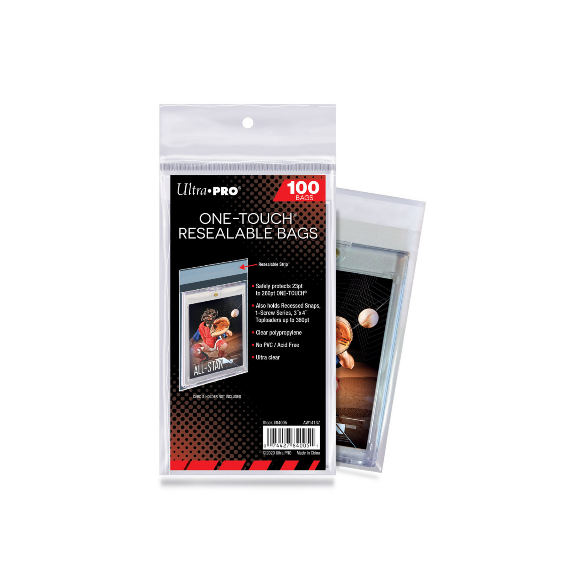 Ultra clear, archival-grade and resealable bags designed for up to 260pt thickness ONE-TOUCH holders. Keep ONE-TOUCH holders from scratches and helps the ONE-TOUCH stay intact during transport. Also holds recessed snaps, 1-screw series, and up to 360pt 3" X 4" toploaders.