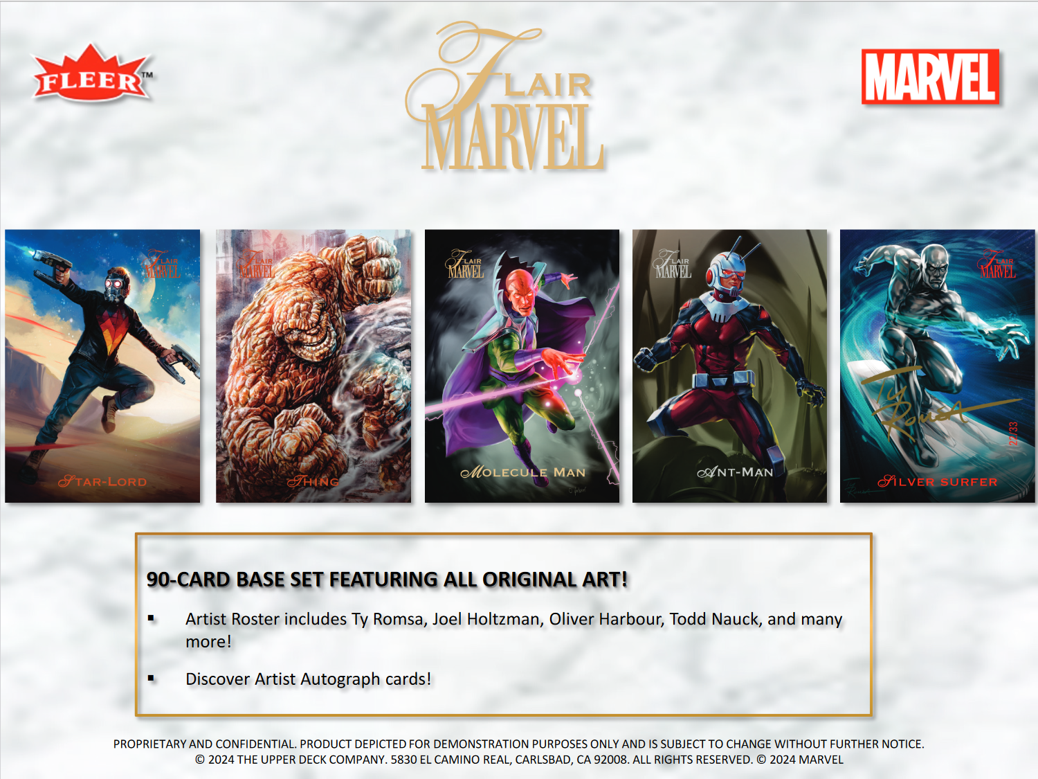 Marvel Flair highlights all-new original art from incredibly noteworthy artists! Collect iconic premium inserts, limited numbered parallels, chase cards, artist and creator autographs, and brand-new inserts!
