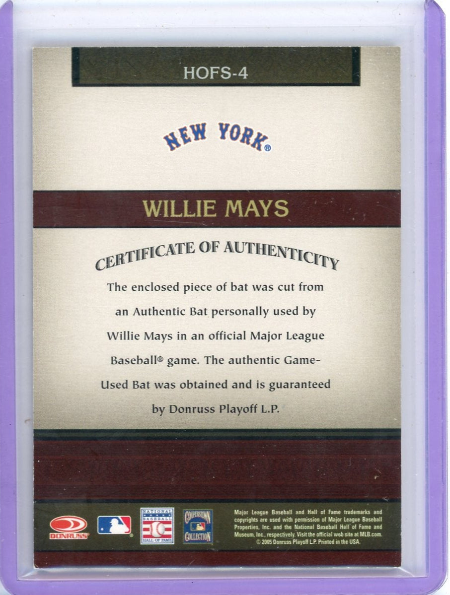 Willie Mays 2005 Donruss Playoff Greats HoF Souvenirs game-used bat relic